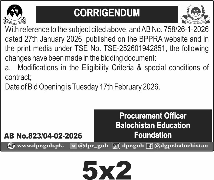 This corrigendum issued by the Balochistan Education Foundation updates the eligibility criteria and special conditions of contract for the referenced tender in Balochistan. It is a formal notification to bidders and stakeholders regarding important modifications that affect the bidding process and contract terms.