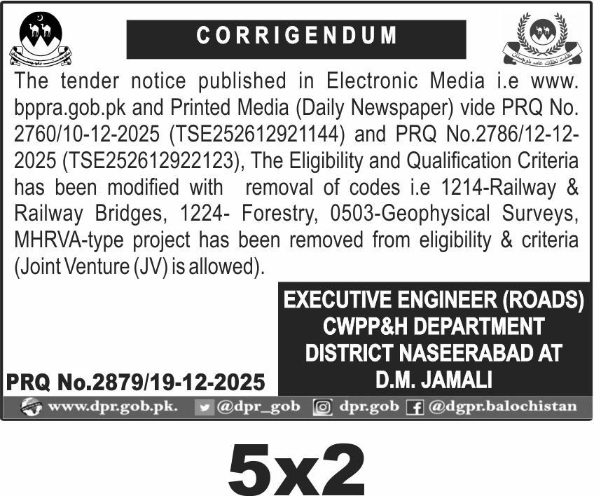Corrigendum for Eligibility and Qualification Criteria Modification for Road Projects in Naseerabad