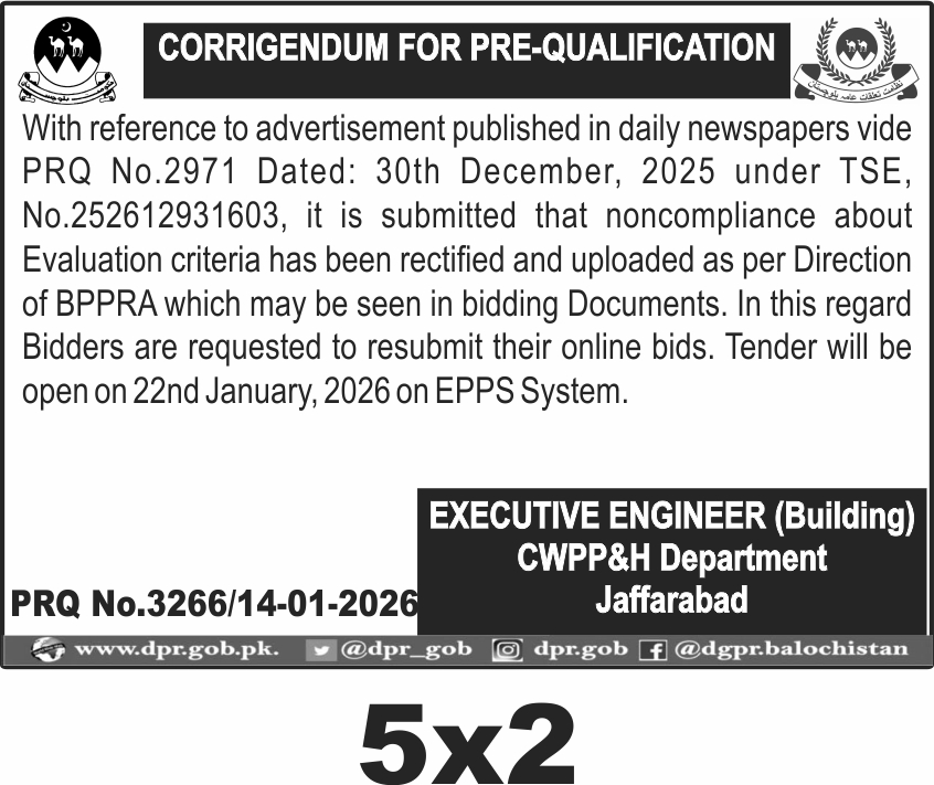 Corrigendum for Pre-Qualification of Construction Works by CWPP&H Department Jaffarabad