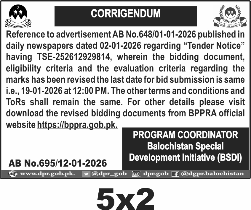 Corrigendum for Tender TSE-252612929814 by Balochistan Special Development Initiative