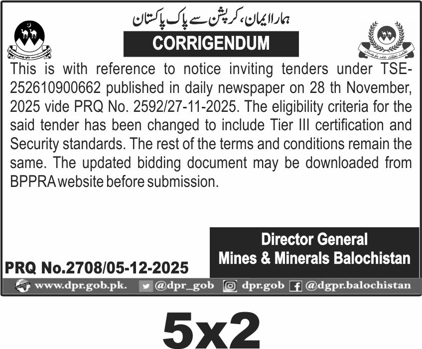 Interested parties must review the updated eligibility criteria before submission. The tender is managed by the Director General Mines & Minerals Balochistan. Bidders should download the revised documents from the official BPPRA portal prior to the closing date.