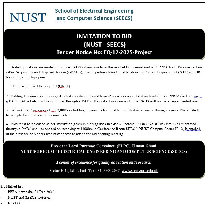 Sealed bids are invited for the supply of a customized desktop PC for the NUST School of Electrical Engineering and Computer Science. Bids must be submitted through the e-PADS system by registered firms with PPRA.