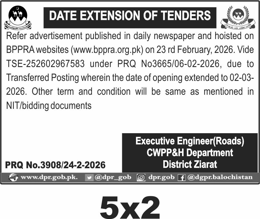 This notice announces a date extension for the road works tender issued by the CWPP&H Department in District Ziarat, Balochistan. The extension moves the bid opening date to 2nd March 2026, allowing interested contractors additional time to prepare their submissions.
