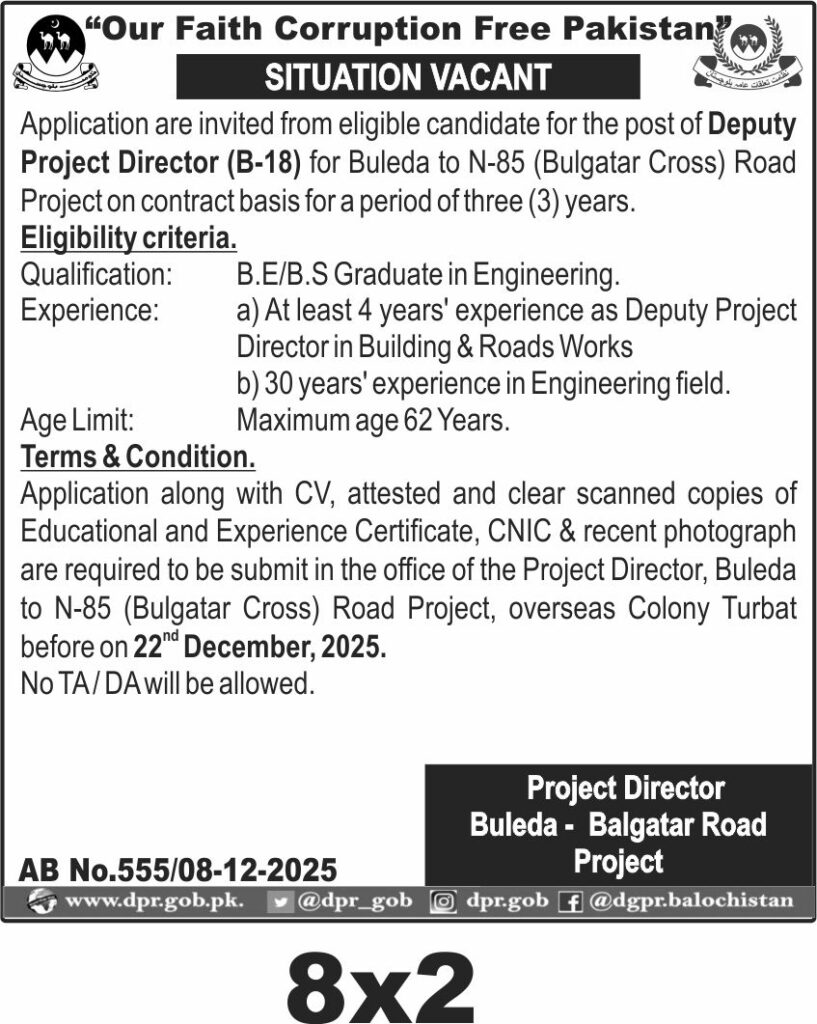Applications are invited for the post of Deputy Project Director for the Buleda to N-85 Balgatar Cross Road Project in Turbat. The position is on a contract basis for three years and falls under consultancy category. The role requires engineering expertise and project management experience in road construction.