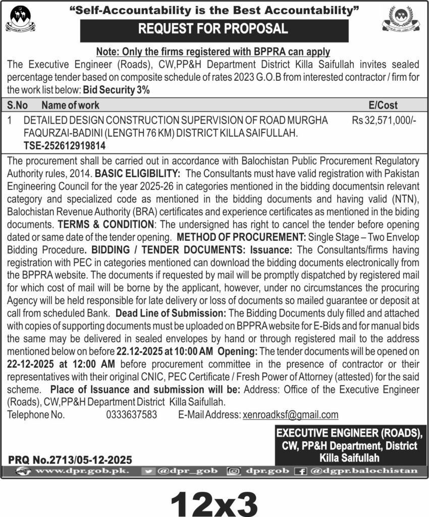 This tender invites sealed percentage bids for detailed design and construction supervision of a 76 KM road from Murgha Faqurzai to Badini in Killa Saifullah, Balochistan. The procurement is for consultancy services related to road infrastructure. The project involves supervision and design services to ensure quality and compliance with regulatory standards.