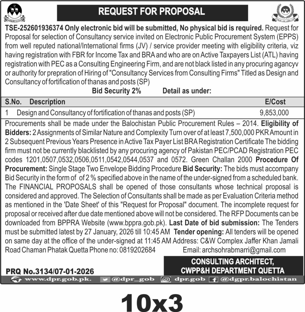 The submission deadline is set for 27 January 2026 at 10:45 AM, with bid opening at 11:45 AM the same day. Proposals must be submitted electronically through the EPPS system. The physical address for bid opening is C&W Complex, Jaffer Khan Jamali Road, Chaman Phatak, Quetta.