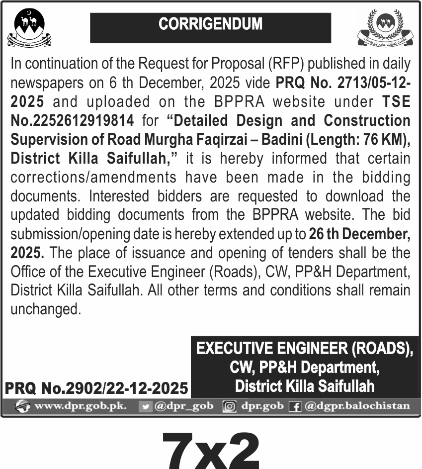 The bid submission deadline is extended to 26th December 2025. The tender is issued by the Executive Engineer (Roads) office in Killa Saifullah. All other terms and conditions remain unchanged.