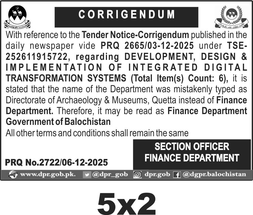 This tender in Quetta involves the development, design, and implementation of integrated digital transformation systems under the IT software category. It covers a total of six items related to digital transformation services. The scope includes comprehensive digital system integration and transformation solutions for government use in Balochistan. The Finance Department Government of Balochistan is the issuing authority. The tender corrects a previous department naming error and maintains all other terms and conditions as originally stated.