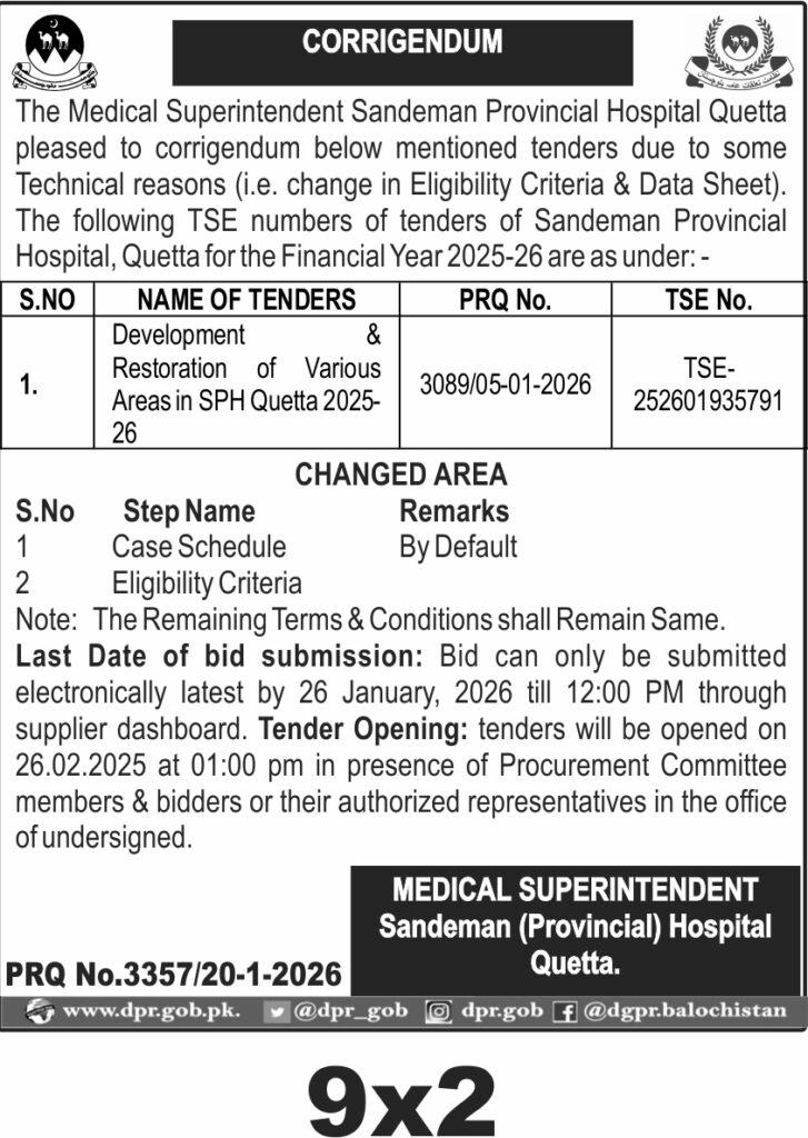 This tender invites bids for the development and restoration of various areas within Sandeman Provincial Hospital located in Quetta, Balochistan. The hospital administration requires skilled contractors to undertake civil works that will enhance the infrastructure and functionality of the hospital premises.
