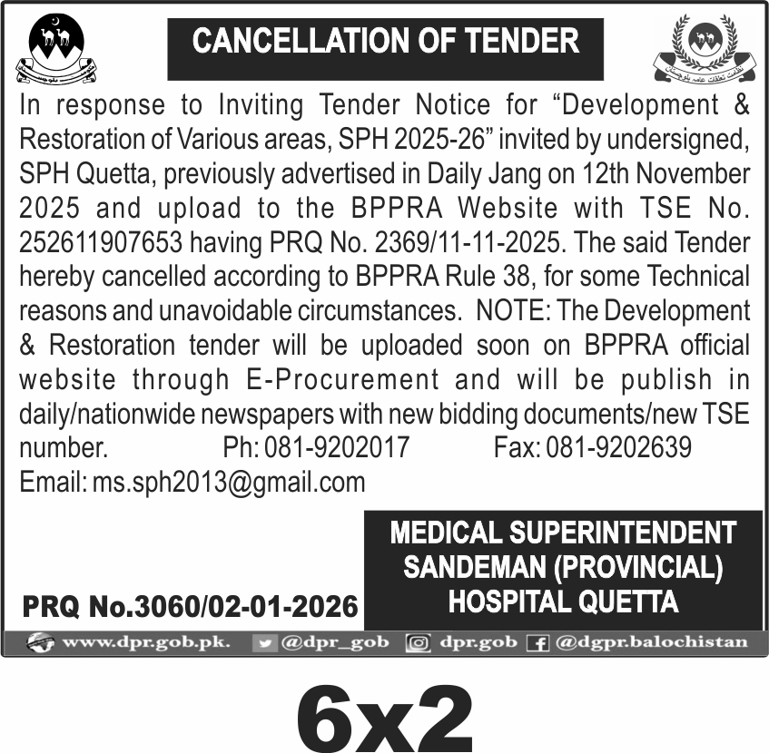 The original tender was cancelled due to technical reasons, but a new tender will be published soon on the Balochistan Public Procurement Regulatory Authority (BPPRA) website with updated bidding documents and a new TSE number. Interested parties should monitor the official portal and daily newspapers for announcements. The submission deadline and opening time will be specified in the new tender notice.