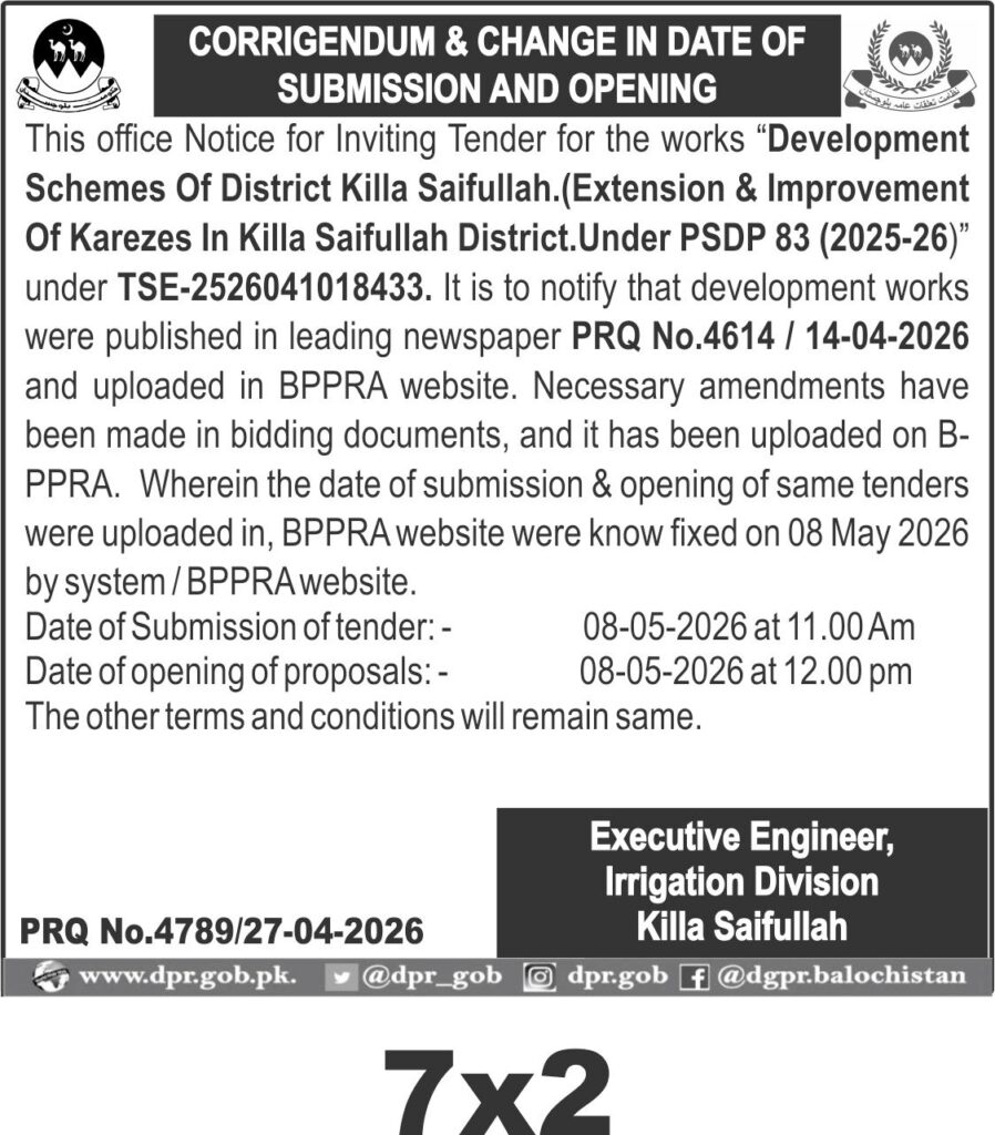 The Irrigation Division Killa Saifullah is procuring development works focused on the extension and improvement of karezes in the Killa Saifullah District under PSDP 83 for the financial year 2025-26. This tender, referenced as TSE-2526041018433, involves civil works aimed at enhancing water supply infrastructure through karezes, which are traditional underground water channels vital for local irrigation.
