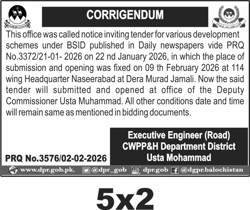 The submission deadline is set for 09 February 2026, with bid opening scheduled the same day at the office of the Deputy Commissioner Usta Mohammad, located at 114 Wing Headquarters Naseerabad, Dera Murad Jamali. Interested parties should ensure their bids are submitted in sealed envelopes before the deadline to be considered.