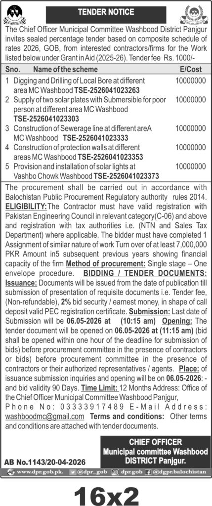 The Municipal Committee Washbood District Panjgur is procuring multiple civil and electrical works under Grant in Aid for the financial year 2025-26. The procurement includes digging and drilling of local bores, supply of two solar plates with submersible pumps for poor persons, construction of sewerage lines, construction of protection walls, and provision and installation of solar lights at Washbo Chowk Washbood. These works are located in different areas of Washbood, Panjgur, Balochistan.