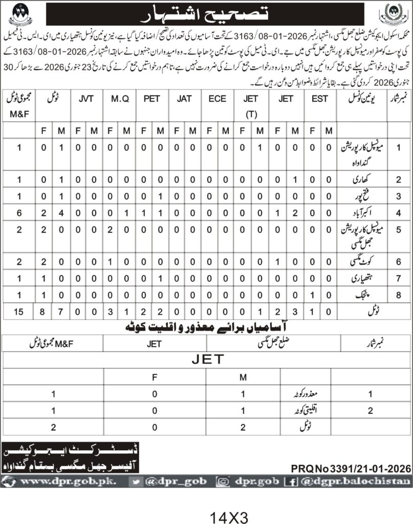 Correction Notice for Elementary School Teacher Position in Jaffarabad District