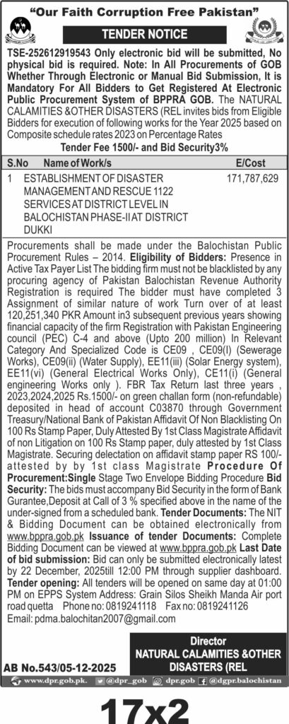 This tender invites bids for the establishment of disaster management and Rescue 1122 services at district level in Dukki, Balochistan. The procurement falls under construction and civil works category. Bidders must be registered and comply with government procurement rules.