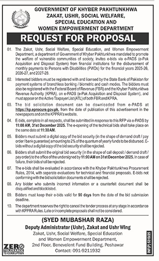 The Government of Khyber Pakhtunkhwa's Zakat, Ushr, Social Welfare, Special Education and Women Empowerment Department invites e-bids via the e-PADS system for the disbursement of monthly payments to Persons with Disabilities (PWDs) for the financial years 2025-26, 2026-27, and 2027-28. Interested bidders must be registered with the State Bank of Pakistan and other relevant authorities.