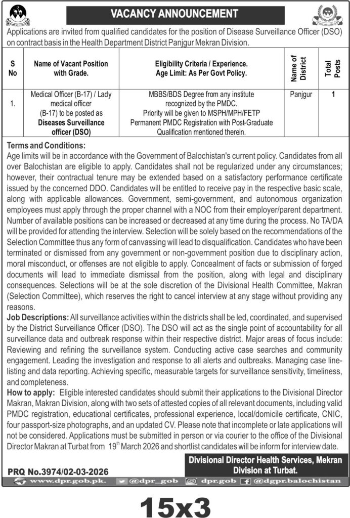 This opportunity is for a Disease Surveillance Officer (DSO) position under the Health Department Mekran Division in Turbat, Balochistan. The role focuses on medical surveillance and public health monitoring within the district.