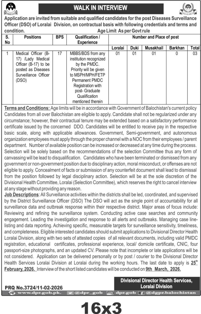 This recruitment opportunity in Loralai Division by the Divisional Director Health Services focuses on hiring qualified Diseases Surveillance Officers (DSO) on a contractual basis. The positions are open across multiple districts including Loralai, Duki, Musakhail, and Barkhan, emphasizing the need for medical professionals with MBBS/BDS degrees and preference for those with MSPH/MPH/FETP qualifications.