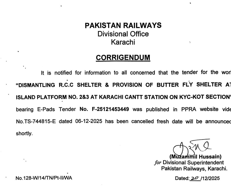 The tender for dismantling RCC shelter and provision of butterfly shelter at island platform No. 2&3 Karachi Cantt Station on KYC-KOT section has been cancelled. A fresh date for the tender will be announced shortly.