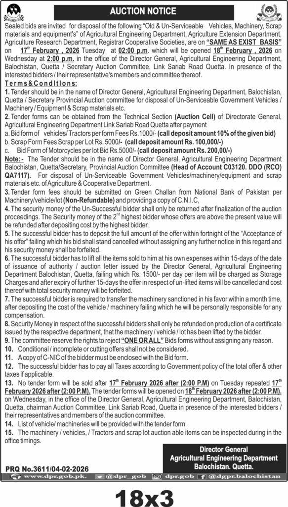 This auction notice from the Agricultural Engineering Department in Quetta, Balochistan, invites sealed bids for the disposal of old and un-serviceable vehicles, machinery, and scrap materials. The auction is scheduled for 17th February 2026 at 2:00 p.m., with bid opening on 18th February 2026 at 2:00 p.m. The department manages assets from multiple agricultural-related divisions, ensuring the sale is on a 'same as exist basis'. This opportunity is ideal for buyers interested in acquiring government surplus vehicles and equipment in Quetta.
