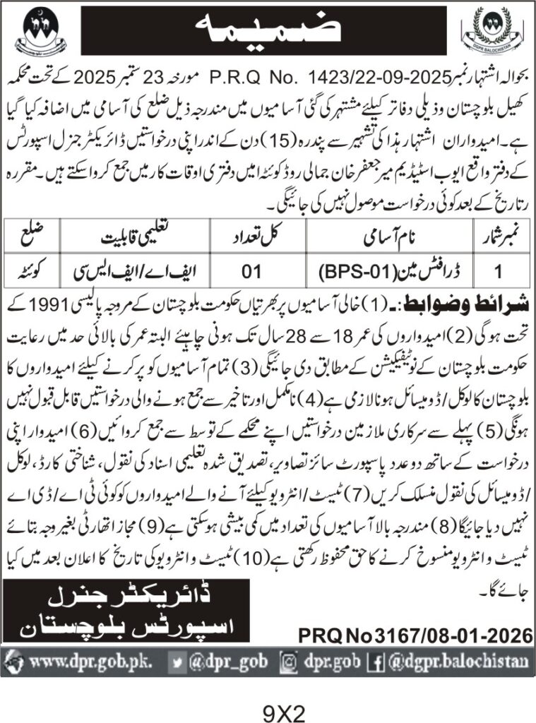This recruitment notice from the Sports Department Balochistan in Quetta invites applications for the position of Driver (BPS-01). The department seeks to fill one vacancy under the government policy of 1991, aiming to strengthen its operational capacity with a qualified driver. Candidates must hold at least an FA/FSc qualification and be between 18 and 28 years of age, adhering to the provincial government's age limits.
