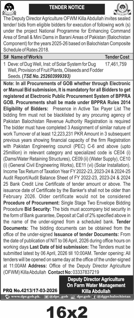 This tender invites bids in Killa Abdullah from the Deputy Director Agriculture On Farm Water Management for the development of a dug well, installation of a solar system for the well, and provision of fruit plants, oilseeds, and fodder seeds. The project supports the National Programme for Enhancing Command Area of Small & Mini Dams in Barani Areas of Pakistan under the Balochistan component for the fiscal years 2025-26.