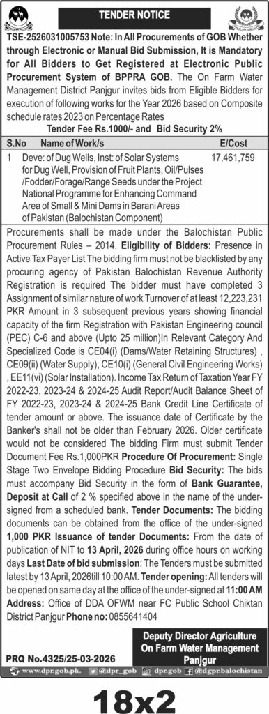 The submission deadline is set for 13 April 2026 at 10:00 AM, with tender opening at 11:00 AM the same day. Bidders should submit sealed bids to the office of the Deputy Director Agriculture On Farm Water Management near FC Public School Chiktan, Panjgur. Tender documents are available for PKR 1,000 during office hours until the closing date.