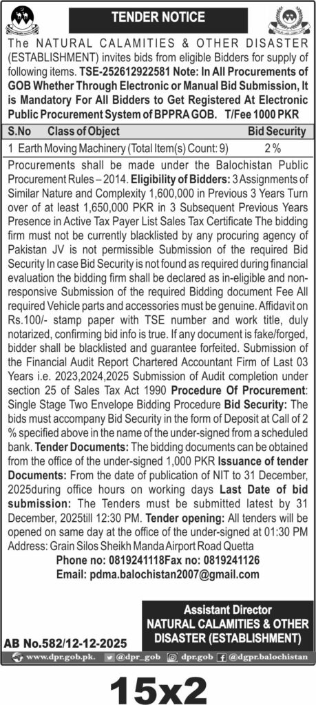 This tender invites bids for the supply of earth moving machinery in Quetta under the category of vehicles and auto parts. The procurement is managed by the Natural Calamities and Other Disaster Establishment with strict compliance to Balochistan Public Procurement Rules 2014. The scope includes supply of nine earth moving machinery items with mandatory registration on the Electronic Public Procurement System of BPPRA GOB.