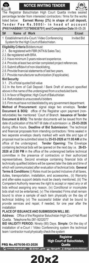 The submission deadline is set for 25-03-2026 at 11:00 AM, with technical bids opened the following day at 2:00 PM at the Registrar's office, High Court of Balochistan, Hali Road, Quetta. Bidders must submit sealed technical and financial proposals in separate envelopes, clearly marked with the work title.