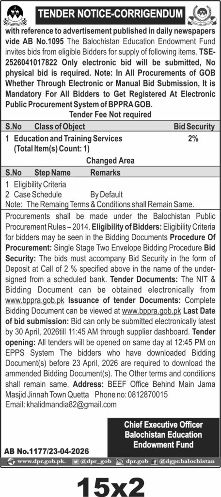 The scope includes provision of education and training services as detailed in the bidding documents available electronically. Bidders must be registered on the Electronic Public Procurement System of BPPRA Government of Balochistan. The bid security is set at 2% of the bid value, payable via Call Deposit Receipt from a scheduled bank. The tender documents can be accessed and downloaded from www.bppra.gob.pk, and bidders who downloaded the documents before 23 April 2026 must download the amended documents as per the corrigendum.