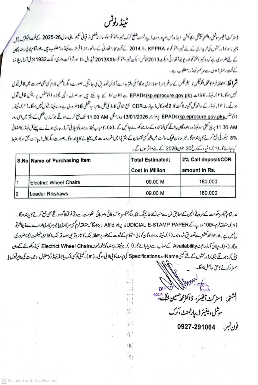 The tender includes two items: electric wheel chairs and loader rikshaws, each estimated at 9 million PKR. Bidders must submit their bids online via the EPADs portal by 11:00 AM on January 13, 2026, with a 2% call deposit. Detailed specifications and eligibility criteria are provided, and all government rules and regulations apply. The tender process includes judicial e-stamp paper and affidavit requirements, with a bid opening scheduled at 11:30 AM the same day.