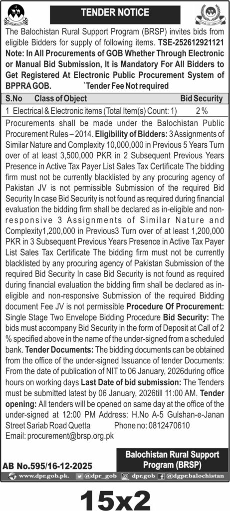 The Balochistan Rural Support Program in Quetta invites bids for supply of electrical and electronic items under public procurement rules. The tender covers procurement of one lot of electrical and electronic equipment. Bidders must comply with eligibility criteria including prior assignments, turnover, and tax registration. The bidding process requires submission of bid security and documents by 06 January 2026 at 11:00 AM. Tender opening will be held the same day at 12:00 PM at BRSP office Quetta. Eligibility includes active tax status and no blacklisting. Joint ventures are not allowed. The bidding documents are available from the issuing office during working hours until the closing date.