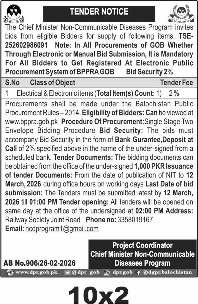 This tender invites bids for the supply of electrical and electronic items under the Chief Minister Non-Communicable Diseases Program in Quetta, Balochistan. The procurement is managed by the Chief Minister Non-Communicable Diseases Program and falls under the Electronics & Appliances category, focusing on essential medical and technical equipment.
