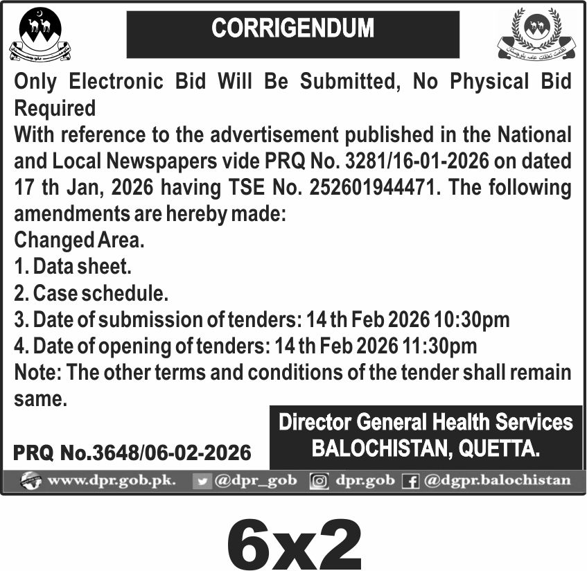 The submission deadline is set for 14th February 2026 at 10:30 pm, with the opening of tenders scheduled for 11:30 pm the same day. Bidders must submit their proposals through the designated electronic portal, adhering strictly to the timelines. The physical address for correspondence is the office of the Director General Health Services in Quetta.