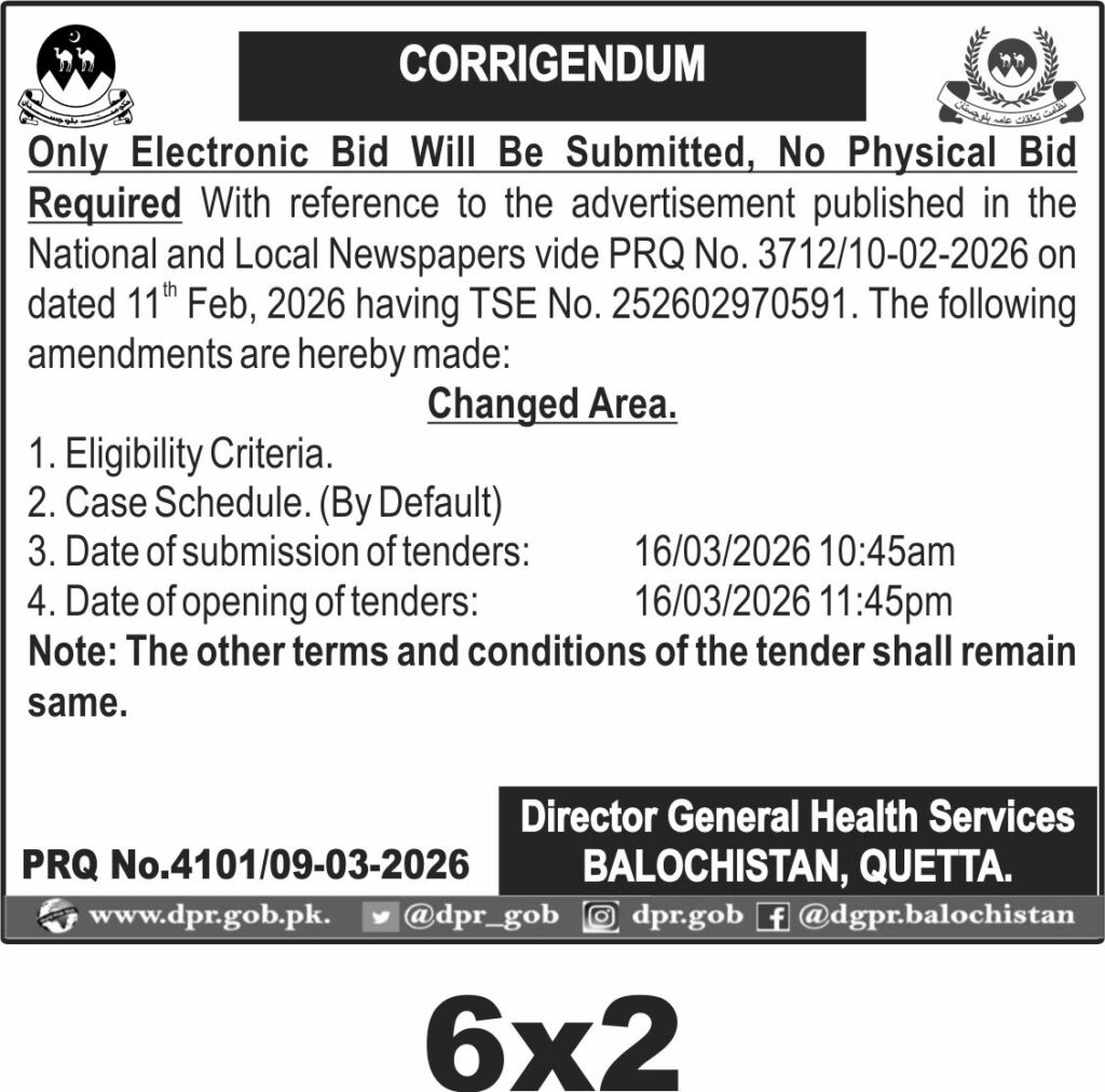 The submission deadline is set for 16th March 2026 at 10:45 AM, with the tender opening scheduled for the same day at 11:45 PM. All submissions must be made electronically as per the corrigendum, and no physical bids will be accepted. The office of the Director General Health Services Balochistan in Quetta is the point of contact for any clarifications.