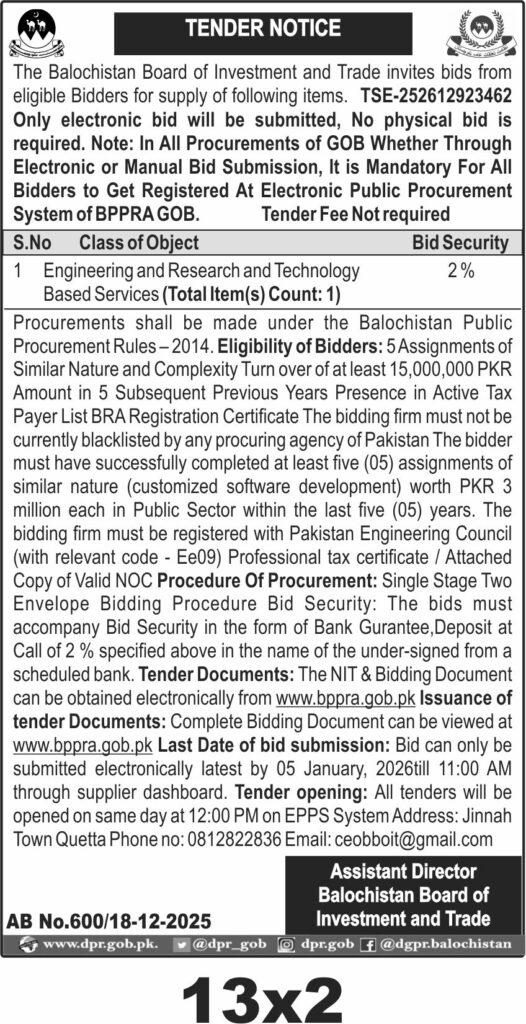 This tender invites bids for supply of engineering and research technology based services in Quetta under the services category. The procurement is managed by the Balochistan Board of Investment and Trade with electronic bid submission only. The scope includes provision of specialized technology services with mandatory registration on the BPPRA electronic public procurement system.