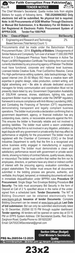 This tender invites bids for supply of engineering and research technology based services in Quetta under consultancy category. The procurement requires electronic bid submission with a mandatory registration on BPPRA GOB system. The scope includes provision of licensed software and high-performance editing systems with expertise in graphic design, video production, and digital advertising. The bidder must have a turnover of at least 17 million PKR and meet eligibility criteria including tax registration and no blacklisting. The tender documents are available online at bppra.gob.pk and bids must be submitted electronically by 30 December 2025 at 2:15 PM. The Chief Minister's Secretariat Quetta will open tenders on the same day at 3:15 PM. Contact details include phone 0819202267 and email QA7002CMSecretariat@gmail.com. The bidding firm must comply with anti-money laundering and financing of terrorism regulations and demonstrate a clean performance record with government or private clients.