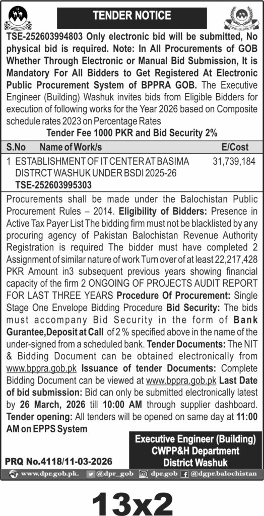This tender invites bids for the establishment of an IT Center at Basima in District Washuk, Balochistan, under the BSDI 2025-26 program. The CWPP&H Department of District Washuk is overseeing this project, which falls under construction and IT equipment categories, reflecting the dual nature of civil works and technological infrastructure development.