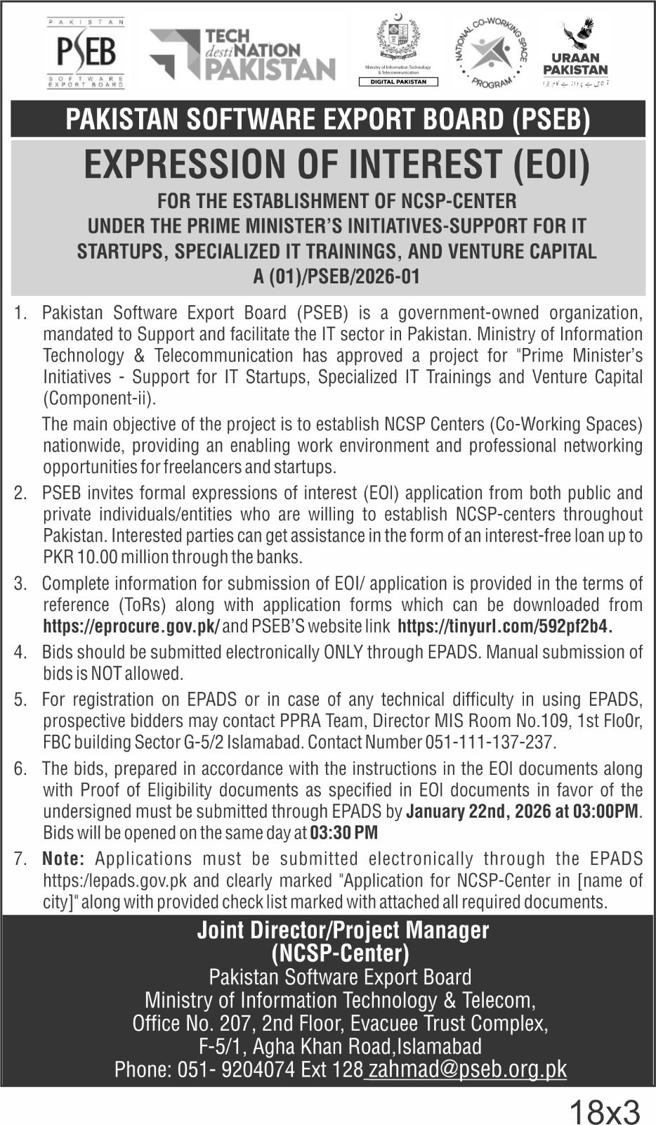 This tender invites expressions of interest for establishing NCSP-Centers under the Prime Minister's initiative to support IT startups and specialized IT trainings in Islamabad by Pakistan Software Export Board (PSEB). The project aims to create co-working spaces nationwide, fostering a professional environment and networking opportunities for freelancers and startups.