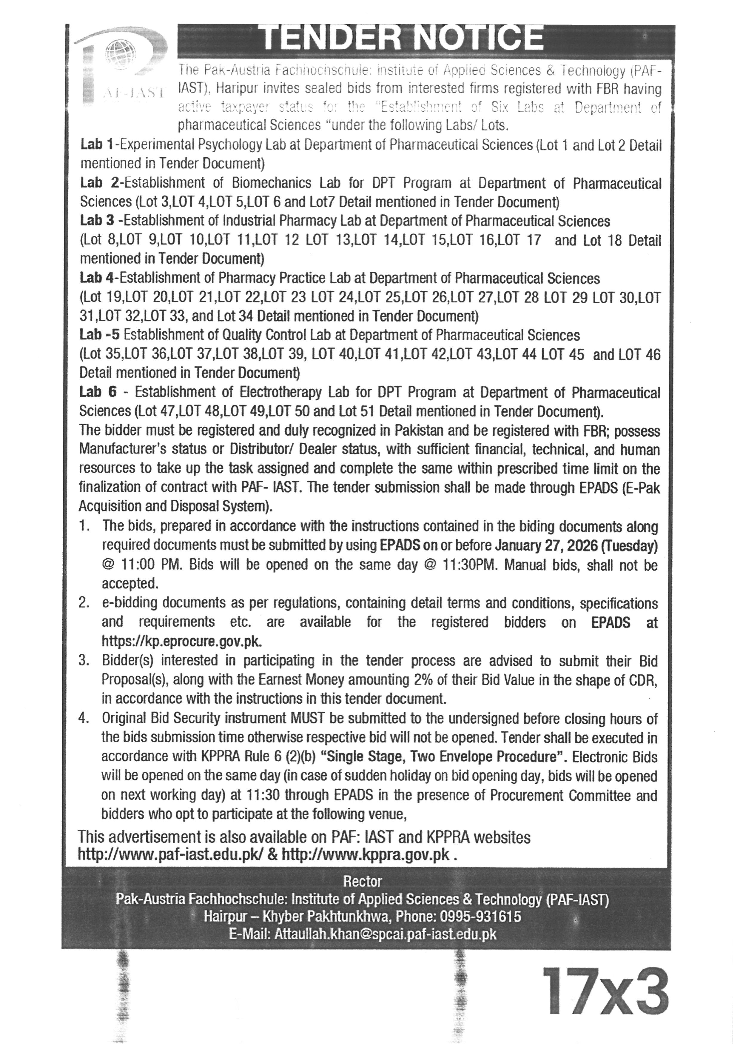 This tender invites bids from FBR-registered firms with active taxpayer status for establishing six specialized labs at the Department of Pharmaceutical Sciences, Pak-Austria Fachhochschule: Institute of Applied Sciences & Technology in Haripur. The labs include Experimental Psychology, Biomechanics, Industrial Pharmacy, Pharmacy Practice, Quality Control, and Electrotherapy, covering a wide range of pharmaceutical and scientific equipment and materials.