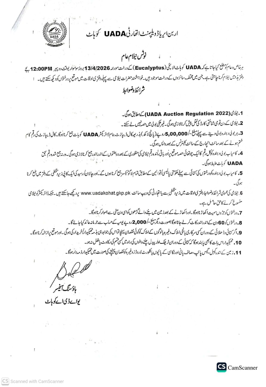 This tender invites bids for the auction of eucalyptus timber by the Urban Agriculture Development Authority (UADA) in Kohat, Khyber Pakhtunkhwa. The auction is scheduled for 13th April 2026 at 12:00 PM, offering an opportunity for local contractors and timber traders to acquire quality eucalyptus wood.