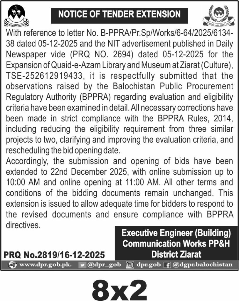 The extension allows bidders adequate time to respond to revised documents and ensures compliance with BPPRA directives. The tender is issued by the Communication Works PP&H District Ziarat department.