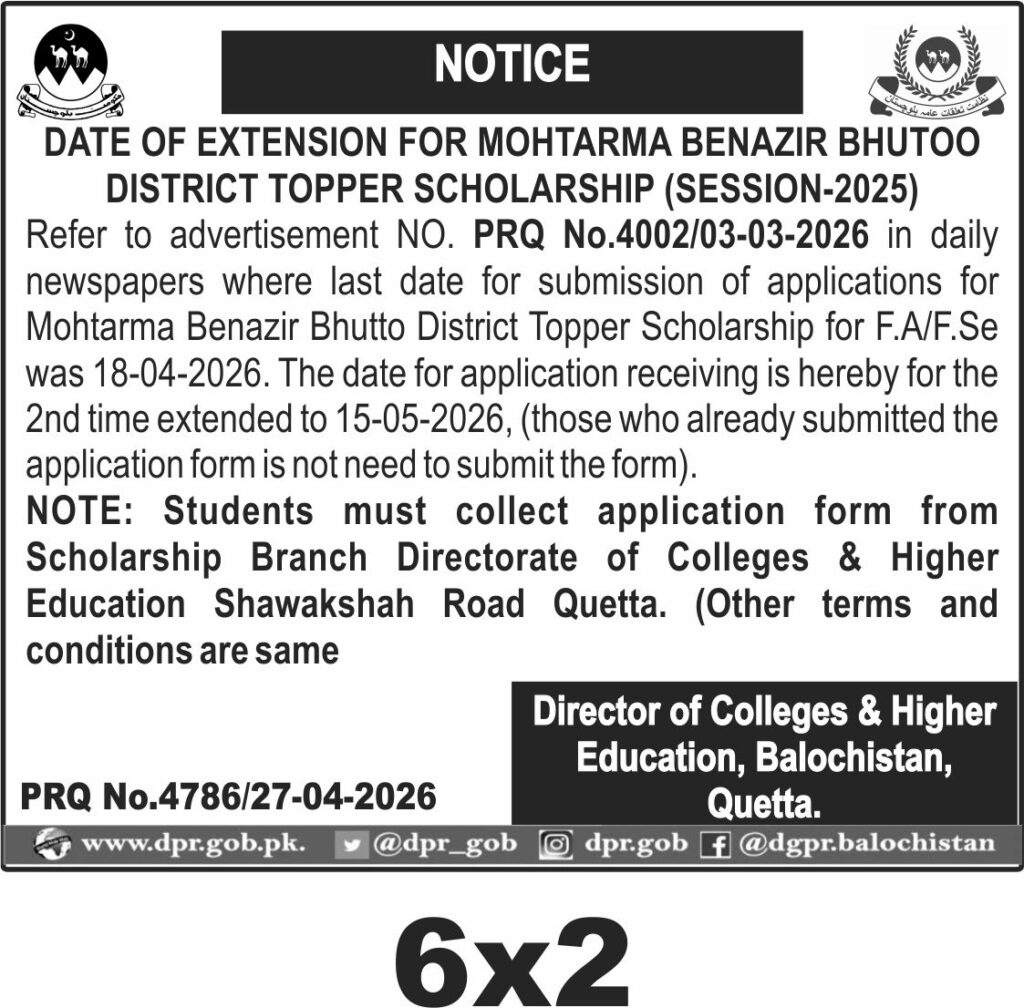 The Director of Colleges and Higher Education Balochistan in Quetta has announced an extension for the submission of applications for the Mohtarma Benazir Bhutto District Topper Scholarship for the session 2025. This scholarship is specifically for students who have completed F.A/F.Sc and aims to support talented students in Balochistan. The original deadline was 18-04-2026, but the submission date has now been extended to 15-05-2026. Those who have already submitted their application forms are not required to submit them again.