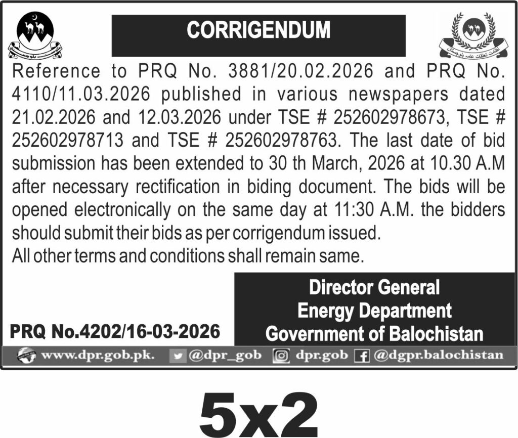 This notice from the Energy Department, Government of Balochistan, announces an extension for the bid submission deadline related to previously published tenders. The extension applies to bids originally due in February and March 2026, now extended to 30th March 2026 at 10:30 AM.