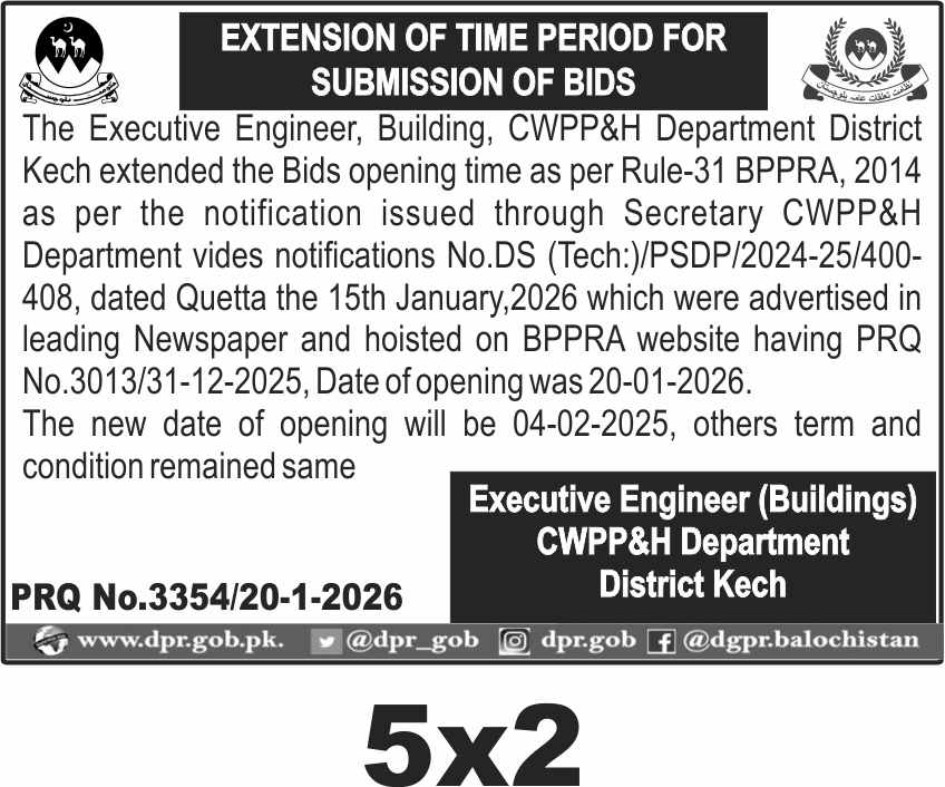 This notice announces an extension for the bid submission deadline for building works under the CWPP&H Department in District Kech, Balochistan. The department is responsible for civil works related to water supply, sanitation, and public health engineering in the region.