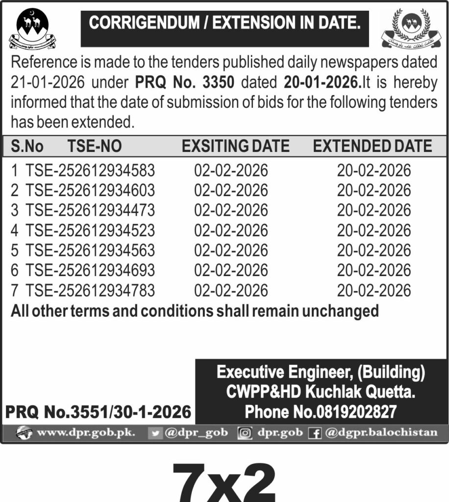 This notice announces an extension for the submission deadlines of several construction tenders managed by the Civil Works and Public Projects & Housing Department in Kuchlak, Quetta. The extension provides bidders additional time until 20th February 2026 to prepare and submit their bids, ensuring wider participation and competitive pricing in the procurement process. The tenders originally had a closing date of 2nd February 2026, now extended to accommodate unforeseen delays or to encourage more competitive offers.