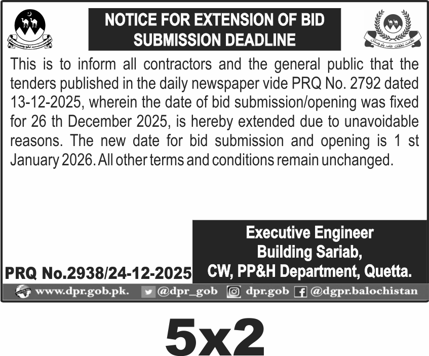The original bid submission date of 26 December 2025 has been extended to 1 January 2026 due to unavoidable reasons. All other terms and conditions of the tender remain unchanged as per the Construction, Works, Planning & Housing Department in Quetta.