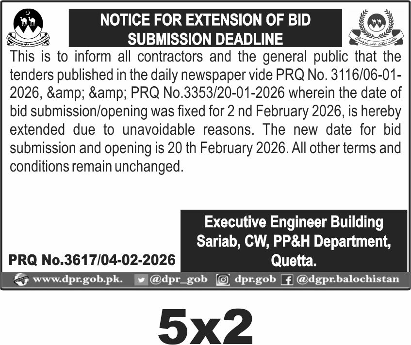 This notice informs contractors in Quetta about the extension of the bid submission deadline for ongoing construction works under the Public Works, Planning & Housing Department. The original deadline was set for 2nd February 2026, now extended to 20th February 2026 due to unavoidable reasons, allowing more time for preparation and submission.