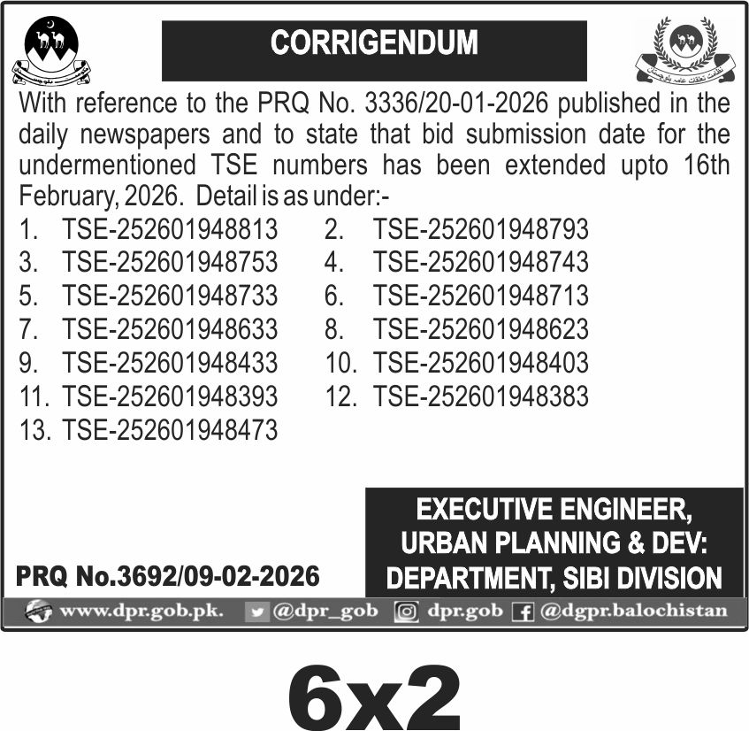 This notice from the Urban Planning and Development Department, Sibi Division, Balochistan, announces an extension for the bid submission deadline for several Tender Submission Envelopes (TSE) related to PRQ No. 3336/20-01-2026. The new deadline is set for 16th February 2026, allowing bidders additional time to prepare and submit their proposals.