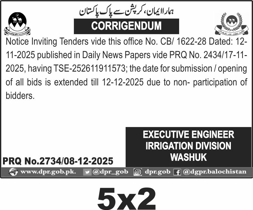 Extension of Bid Submission Date for Irrigation Division Washuk Tender